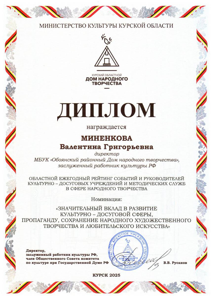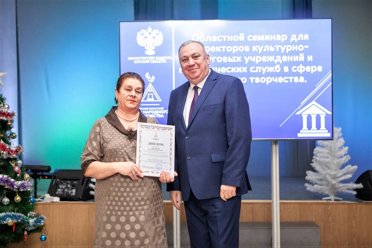 11 декабря в Курском областном дворце культуры им. В.Н. Винокура состоялся семинар для директоров КДУ и руководителей методических служб «Приоритетные направления деятельности культурно-досуговых учреждений региона в современных условиях». Директор Курского ОДНТ, заслуженный работник культуры России Владимир Русанов, подвел итоги уходящего года и рассказал об изменениях, которые ожидают культурно-досуговые учреждения в 2026 году. Совещание завершилось вручением дипломов за участие в областных проектах. Директор Обоянского районного Дома народного творчества, заслуженный работник культуры Валентина Миненкова была награждена дипломом в номинации «Значительный вклад в развитие культурно-досуговой сферы, пропаганду, сохранение народного художественного творчества и любительского искусства. Желаем новых творческих успехов и побед!