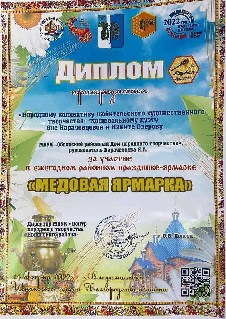 14 августа  представители Обоянского РДНТ  Народный фольклорный ансамбль «Ивушки» и  танцевальный дуэт Яны Карачевцевой и Никиты Озерова  стали участниками ежегодного районного праздника - ярмарки «Медовая ярмарка» в селе Владимировка, Белгородской области.
