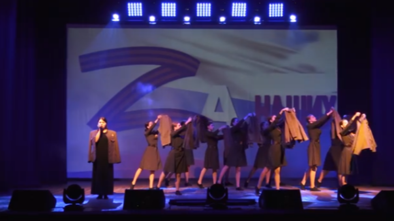 Елена Голубятникова и участники студии эстрадного мастерства «Триумф» присоединяются к акции «Хотят ли русские войны?». Звучит песня Р. Рождественского и Е. Птичкина «Довоюй, родной».
